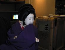 で、実は今回一緒に観に行った友人の一人が、演者に知り合いがいるということで、なんと幕間の時間に楽屋へ遊びに行かせていただいたのです。短い時間でしたが、人形を間近で見せていただいて、舞台裏も覗かせていただいて、もう、大興奮で感激しまくりでした(笑)。興奮し過ぎであまりちゃんと撮れなかったのですが、その時撮影させていただいた写真をいくつかアップしてみます。