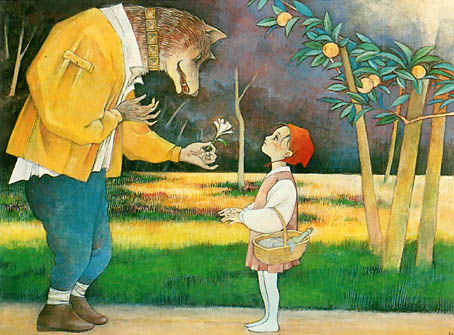 赤ずきんが森にさしかかったとき、狼と出くわした。