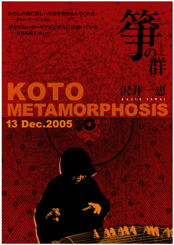 このチラシのデザインの中で、私自身が一番手間をかけたのが、「箏の群」のタイトル部分。既存の明朝の書体をベースにしていますが、PC上である程度形を整えてから出力し、それに手描きのトレースを加えてからスキャンニングし、再びデジタルで微妙な変形をかけたりしながら、最終的にこの形に仕上げました。PC上で仕上げまでの加工を全部やってしまうこともできるのですが、あえてアナログっぽさを出したかったので手描きでレタリングする工程を加えたりしてみたのです。