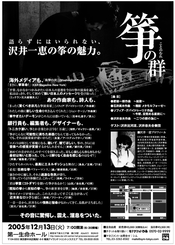 琴奏者・沢井一恵さんのコンサートのポスターを、シルクスクリーンでつくったという記事を少し前に書きました。そのライブのご案内をしようと思いつつ、すっかり遅くなってしまいました。以下ライブのインフォメーションです。