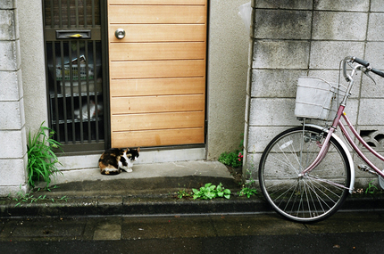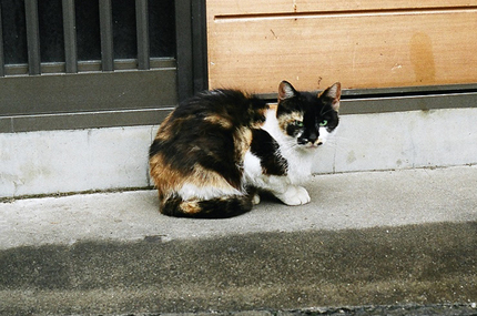 知らない家の玄関で、ずっと待ちぼうけを喰らう三毛猫。