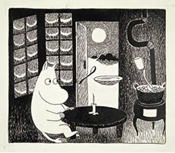 私はムーミンの物語以上に、トーベ・ヤンソンの描く絵が大好きです。絵のタッチを真似したくて、何度か模写してみた時期もあったくらい。今回はじめて原画を見ることができたのだけど、想像以上に素晴らしく、原画で見るペンの描線はすごく繊細で美しかったです。描いている情景によって様々なタッチを織り交ぜてあって、場面の空気感まで描き出しているのです。夜の暗い森の場面では太めな重い描線で描かれ、霧が立ちこめるシーンではとぎれとぎれの細い線で描いてあって、走っているシーンでは流れるような鋭い線が勢いよく画面を駆け抜けて・・・という具合に。