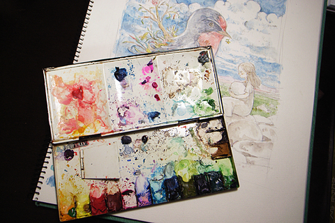 わたしの相棒 かれこれ30年近く使ってる、わたしのパレット。透明水彩はこうやって絵具をパレットに固めておいて、彩色するときに水を含ませた筆で溶きながら色を拾っていくのです。長い時間一緒に過ごしてきた、わたしの大事な相棒です。 だったら、もう少しきれいに使ったら?と言われてしまいそうですが・・・汚れてるように見えるかもしれないけど、この色の混じりあってる部分が絵を描く上では大事なのです。掃除が面倒で放置してるわけではないのですよ。いや、本当に…。 前の記事 次の記事 コメント のぶ 2010年7月 1日 18:00 優しい絵を描かれるんですね。 今更、よこやまさんが絵描きさんだと知りました。 どうりでお写真も、懐かしく優しい雰囲気が匂うんですね。 時間が許す時に、ブログ最初から楽しみながら拝見させて頂きます。 よこやま 2010年7月 5日 14:15 >のぶさん うれしいコメントありがとうございます! 「懐かしい感じ」と言っていただけるのが、一番嬉しい感想です。 私はデザインの仕事が本業で、「絵描き」という程ではないんですよ。 でもずっと描き続けていけたらと思ってます。