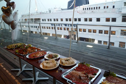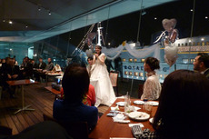 お店に入ってしばらく歓談している時間に、ちょうど真横に大きな客船が真横に停泊していて、まるで海の上でパーティーをしているような気分に。。そして新郎新婦入場のタイミングで、客船は大きな汽笛を鳴らして出稿!感動的な、素晴らしい演出でした。