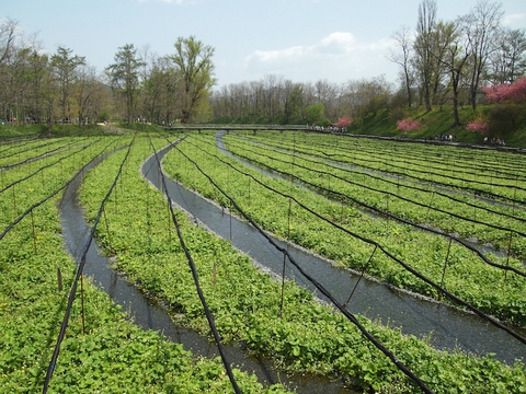 しっかし、さすがにGWの中日。道路は遥か先まで大渋滞!!その大変な様子を尻目に、私ら自転車族は軽快に走り抜けて、駅から15分くらいで「わさび農園」へ。