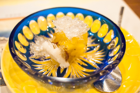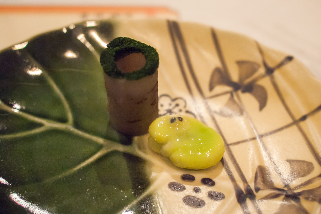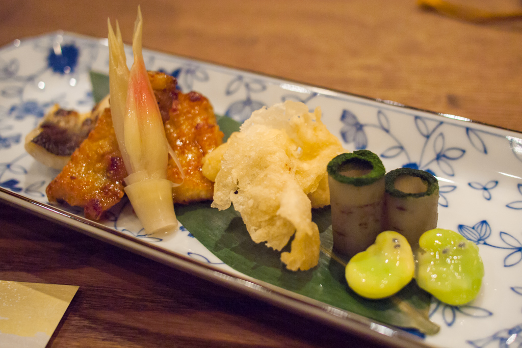 カウンターの席に腰をお落ち着けて、最初に出てきたのがこの料理。一品一品とても丁寧に造られていて、一口食べるごとに幸せな気持ちになります。見た目も仕事が繊細で素晴らしい。そして、空豆がなんとカエルの顔!(笑)。なんとかわいい細工なんでしょう。