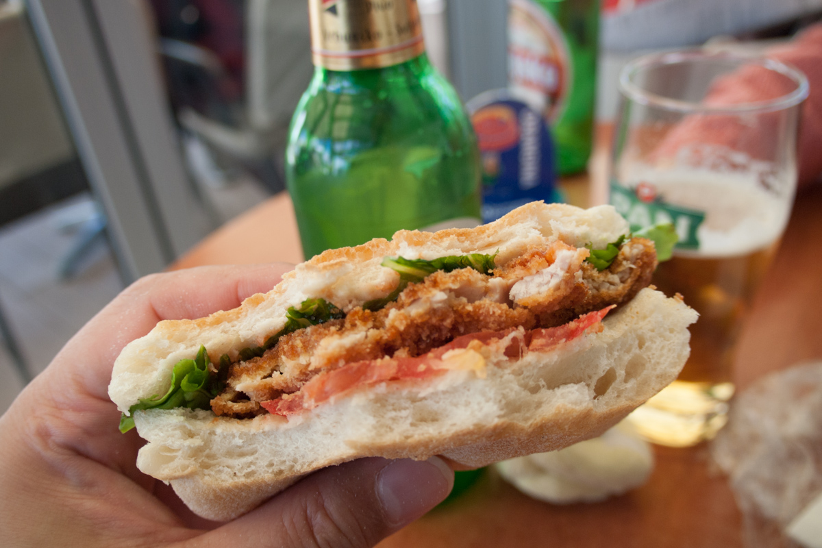 飛行機疲れなどしていられない。空港での待ち時間もめいっぱい楽しまなければ。。ザグレブ国際空港は、国内線のようなこじんまりとした空港。散策するほどの施設もないので、空港内あったカフェ&レストランへ。美味しそうなカツレツのサンドイッチがあったので、それにかぶりつき、さっそくクロアチアビールで乾杯♪