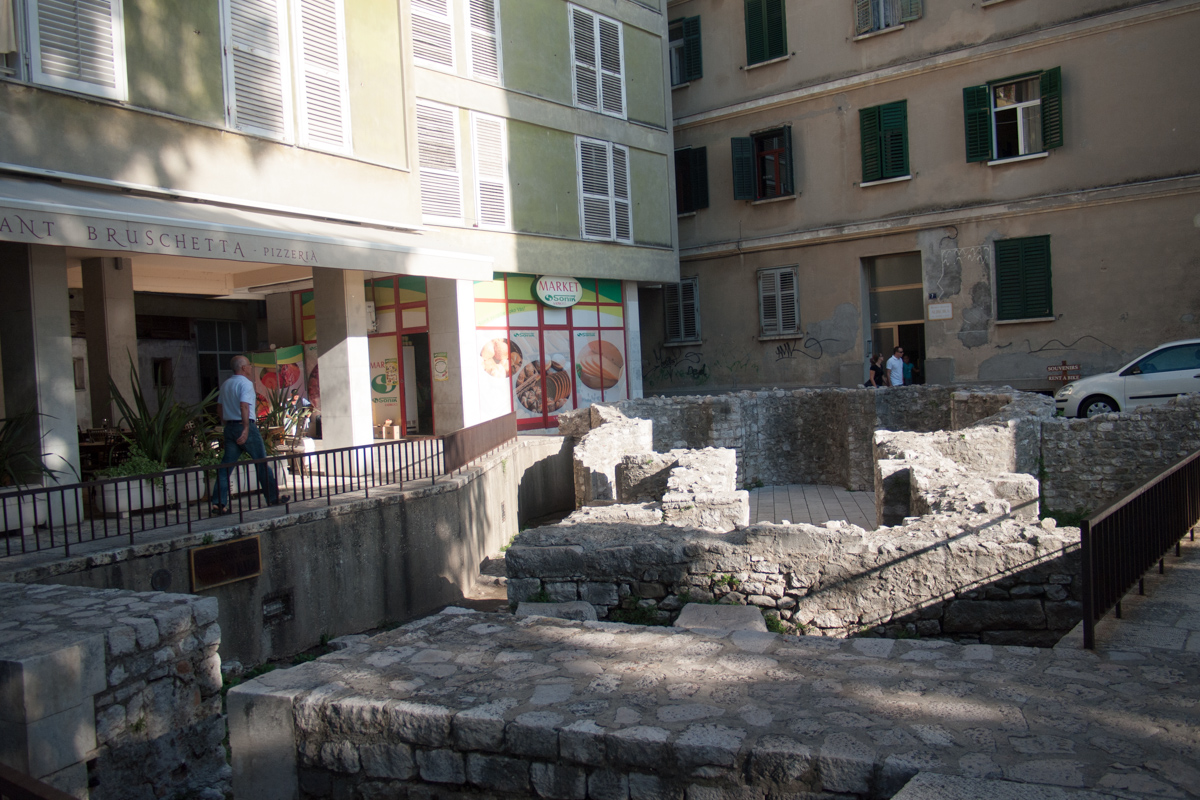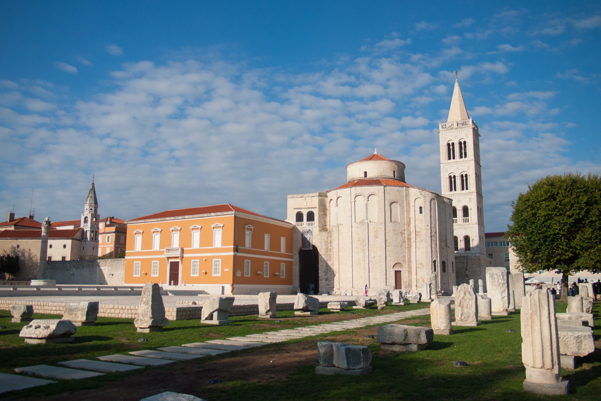 有名な聖ドナト教会やストシャ大聖堂、聖マリア教会などが建ち並ぶ「ゼレニ広場」を歩く。ここはかつてローマ時代の広場(フォロ)があったところ。ここにもローマ時代の遺跡が、あちこち無造作に並んでいる。夕刻の斜光に照らされて、白い石材の聖堂と塔が輝いて見える景観は、思わず感嘆の声を上げてしまうほどの美しさ。
