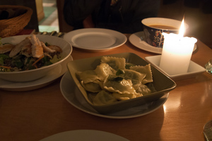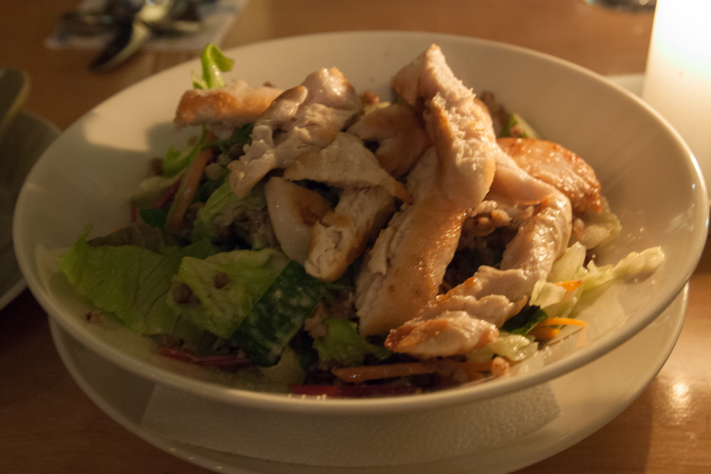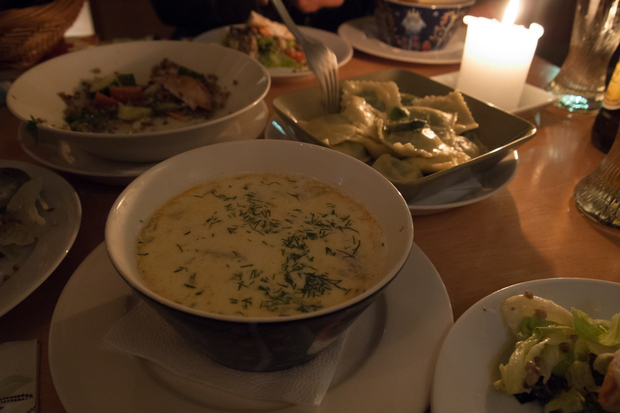 そしてこれが注文した料理。サーモンの入ったクリームスープとチキンのサラダ、そしてベジタブルなラザニア。すっごく美味しそうでしょう?? ...ところが一口食べてみると、なんというか...ひと味足りない感じ。料理と一緒に運ばれてきたソルト&ペッパーのミルで、思い切りよく塩気を足したらまぁまぁな味になりました。ただ、食べながら思ったのは、観光客向けのお店では誰でも美味しく感じるように、少し濃いめの味付けにしてあって、実際はここで食べた料理のようにちょっと素っ気ない味付けの方がスタンダードなのではないでしょうか。そうでなければ、こんなにも客が賑わうわけはないのですから。その土地ならではの味を体験してみることこそ、旅の何よりの醍醐味ですよね。
