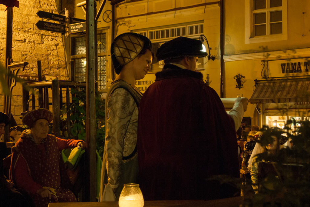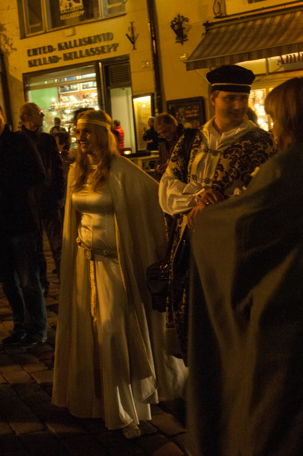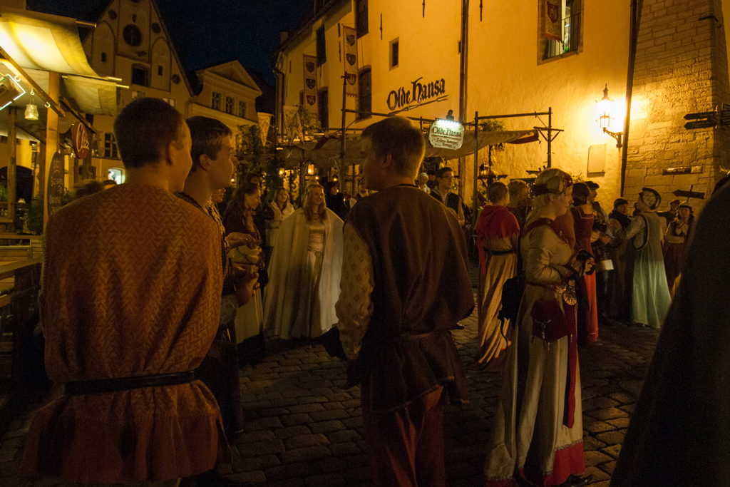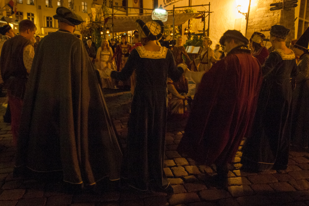 食事を楽しんだあと、ラエコヤ広場の方へと歩いていたら、突然大勢の人垣に遭遇。なんだろう・・・?と、肩越しに向こうを覗き込むと、中世の世界から抜け出してきたような人たちが輪になって踊っているではありませんか!