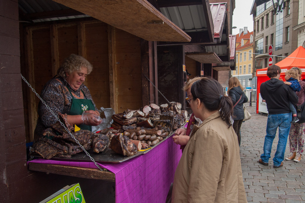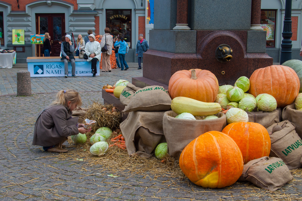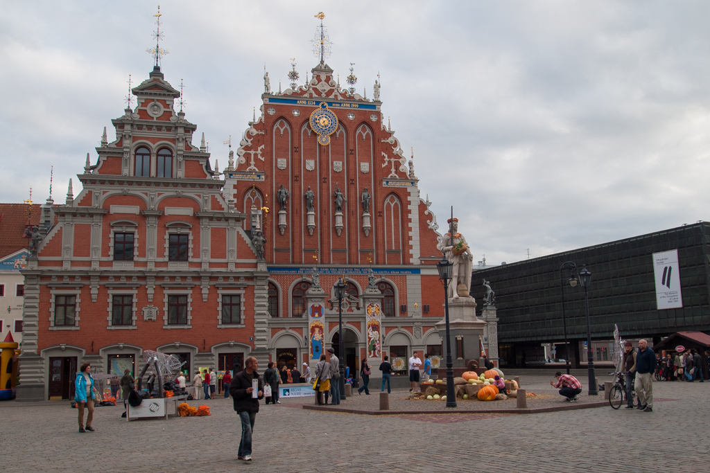 市庁舎広場に抜けると、運良くここでも収穫祭をやっていました。後ろの印象的な建物は、有名な「ブラックヘッドの会館」。ブラックヘッドとは未婚の貿易商人の友愛会なのだそうです。第二次大戦で破壊されたのですが、近年になって忠実に再建されました。