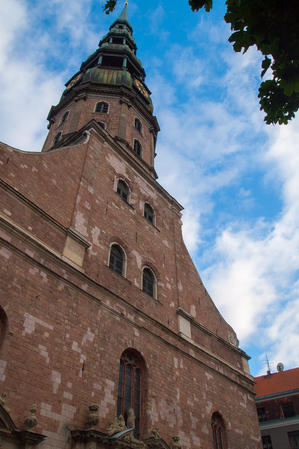 旧市街に入ってほどなくして出会ったのが、この聖ペテロ教会でした。ゴシック様式の荘厳な美しい教会。私は時間なくて行けなかったのですが、ここから塔の頂上までエレベーターで上がれます。そこからリガの街全体を見渡すことができて、素晴らしい景観なのだそうですよ。
