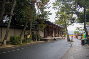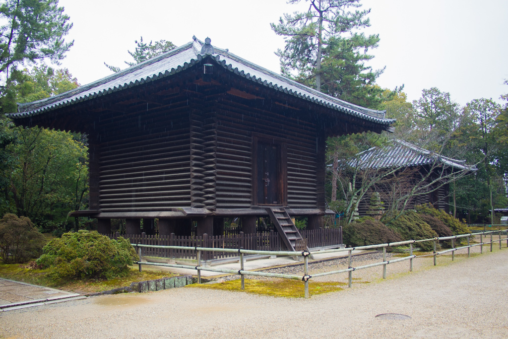 無造作に建ち並んでいる国宝の「宝蔵」。奈良時代に造られた校倉様式の建物。