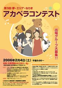 おお! あのかわいらしいイラストは「アカペラコンテスト」のポスターになったんですね。楽しそうで、とってもいい感じですね♪ それにしても、練馬区はなかなか素敵な催しをやるもんですな。元練馬区民としては気になります。大泉学園はその頃、よくバイトで行ったものです。東映の撮影所の前のオズという大きなスーパーで、バレンタインや、弁フェアの売り子をやったっけなー。