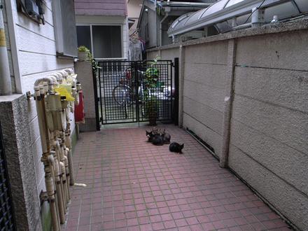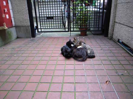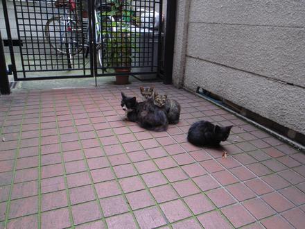 遅めの昼食のラーメンを新井薬師で食べてから、その帰り道。建物の写真撮ったりしながら歩いてたら、またまた猫に遭遇! しかも野良猫家族・子猫三匹!! 猫好きなら、この光景に萌えない人はいないでしょう(笑)