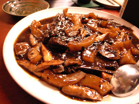 基本的には沖縄料理屋なのですが、店主のアレンジで美味しい料理がいろいろ。これはスペアリブとパパイアの黒豆ソース煮。高級中華店にも負けない味!
