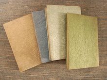 あらためて自分の部屋の書棚を見回してみたら、ブックカバーがいろいろありました。左の写真は和紙でできてるブックカバー。この和紙の感触がとても気に入って、お店にあるのを一人で買い込んでました。あまり売れる商品ではなかったようで、そのお店で私が買い尽くした後は、もう二度と入荷されることなかったです。愛用してたのですが、二十年くらい前に買ったものなので、もう薄汚れてしまっててみっともないです。右のやつは、よくある合革でできたブックカバー。素っ気ないのですが、こういうのもあると結構便利なものです。写真撮らなかったのですが、本革のすごく高かったブックカバーも1点あるのだけど、なぜか寸法がどの本にも合わなくて、ほとんど使ったことないのもありました。