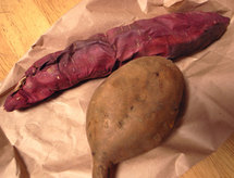 で、家帰ってから食べてみましたが、ご想像の通り、と〜っても甘くて美味しかったです。甘味料が入ってるんじゃないかと思うくらい甘味が強くて。どっちかっていうと、この細長くて赤っぽい方が美味しかったかな。皆さんにお裾分けできなくて残念ですが、せめて目で味わってくださいませ。芋大好き!という方は。
