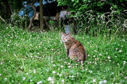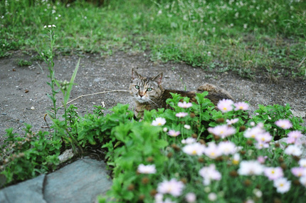 近所の小さな空き地で、夕方撮りました。この猫は愛想がよくてポーズ(何気にカメラ目線?)をとってくれるから、余計にシャッターを押してしまうのでした。この猫だけに10枚くらいフィルム使ってしまいました。つきあうのにお金がかかるタイプです。
