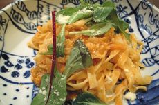 金沢市役所裏に流れる川と、近所のお店で食べた「カニ味噌手打ちパスタ」。