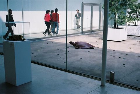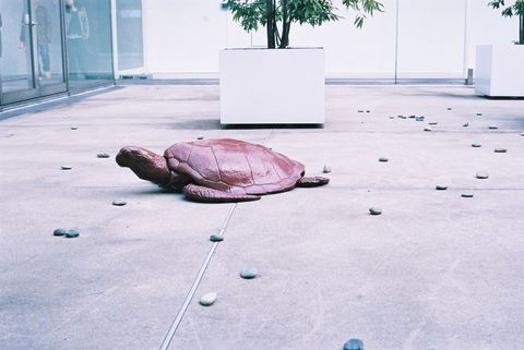 中庭にディスプレイされていたのは、粟津さんの作品の象徴ともいえる「ウミガメ」。明るい日差しに照らされて、気持ち良さそうでした。