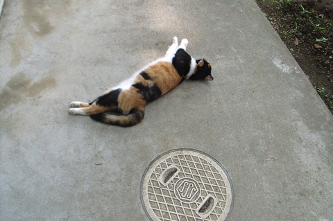 次に出会ったのがこのネコ。やはり日陰のコンクリートに寝っ転がってるとすずしいのでしょうか?