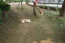 このネコはまたまた大胆にも、公園の道の真ん中に寝転んでました。散歩中の犬が近づいてもまったく逃げる気配なし。犬の方が怖がってなかなか通れなくて、飼い主の人としばらくおしゃべりしてたのですが、この犬はとても性格が優しいそうで、ネコの横を通り抜けることができなくて、最後は飼い主さんがリードをつけて引っぱって連れて行きました。