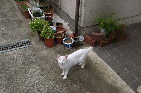 みつめあいました 通りがかりの塀の向こう側の猫と目が合って、じばらくじっと見つめ合いました。逃げるでもなく、近づいてくるわけでもなく、ただじ〜っとこっちを見てました。じ〜っと。 前の記事 次の記事 コメント よりこぐま 2008年9月18日 11:33 すごいなー。 わたし、こういう風に写真撮れないんです。 猫との距離感がめちゃくちゃになっちゃう。 逃げられるか、寄り切られて負けるか。 寄り切られると、猫なんだか毛糸なんだかたわしなんだか わかんない写真になってしまう・・・ まろろん 2008年9月18日 21:32 なかなか野性的な顔の白にゃん子ですね。 時々町で目があって、じっとネコと見つめあうことってありますよね。 私も昨夜、ぶちのにゃん子と道路でにらめっこしてました・・ お互いしばらく動けず・・^^ よこやま 2008年9月19日 14:21 >よりこぐまさん 外猫でも人になついてると、むやみにすり寄ってくる猫っていますよね〜。 そこでそのままにしてて〜!って思っても ゴロニャ〜ンって来られるとなすすべなく・・・ 私もわけのわからない毛むくじゃら写真がたくさん残ってます・・・ よこやま 2008年9月19日 14:28 >まろろんさん この猫、きりっとした顔立ちで美しいですよね。 ちょっと洋猫が入ってるのかな? この猫は私が立ち去るまでずっとこの顔してました。 猫とにらめっこになった時って、どっちが先に動いたらいいかな? って、しばらく考えてしまいますよね・・
