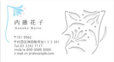 右上の名刺は立て幅が通常サイズの半分、エコサイズになっています。シンプルな図案ですが、結構人気あります。横に丸い穴が空いていて、ここにリボンとか通してもらえるとかわいいかなって考えてデザインしました。