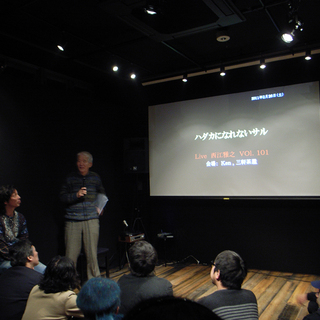 この日のライブ・トークは「ハダカになれないサル」というタイトル。「"装う"とは如何なることか」という話題が今回の中心となるテーマ。まず、「ハダカ」とは如何なる状態なのかが問われる。「ハダカ」はまったく衣服をまとっていない、肌がすべて露出した状態のことではない。たとえ衣服や身体的な装飾をすべて取ったとしても、髪型や爪の形、肌の色等、依然として装いを身にまとっているのであり、人間は「けっしてハダカになれないのだ」という指摘が、とても刺激的だった。