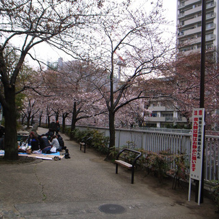この間の日曜日、東中野の沖縄料理店「おもろ」主催の花見会に行ってきました。飲み代の一部を被災者支援金に充てるという、チャリティーを兼ねたお花見会。まずはお店の前へ4時に集合。皆で早稲田通りをしばらく歩いて、神田川沿いの遊歩道で陣地を取りました。たまたまあった石が、ちょうどいいテーブル代わりに。まだ桜は半分も咲いてなかったけど、花見を楽しむには充分に、華やいだ景色を見せてくれましたよ。