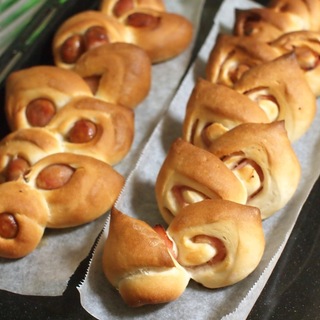 ちなみに自分の自宅で挑戦してみたのだけど、1回目は生地作りの段階で見事に失敗...。2回目でやっとどうにか形になりました。右はレシピ通りのベーコンを、左はソーセージを丸めてみた。1次発酵が不充分だったのと、黒こしょう入れ忘れたのが反省点...。