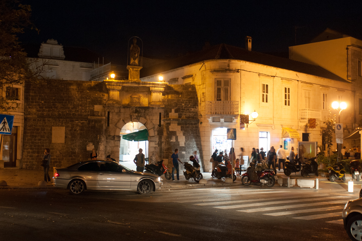 トロギールまでは、車で1時間くらいの距離。6時前にシベニクを出たはずなのに、この日は渋滞もあったりで、結局バスターミナルに着いたのは夜の7時半くらい。旧市街へとつながる橋の周辺には、たくさんのバイクや車が行き交い、これからどこかへ繰り出そうとする若者たちが次々と集まっていました。