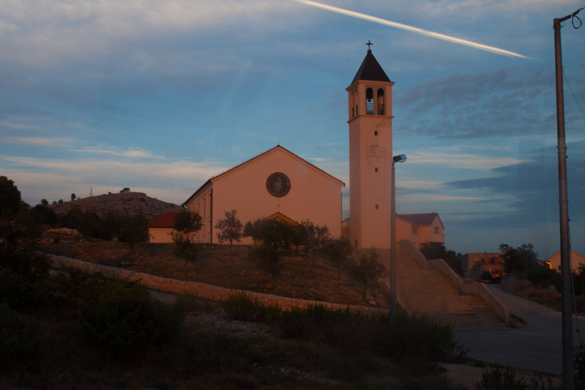 アドリア海に沿って走る幹線道路を、路線バスは南へと走る。途中、海に沈む大きな夕陽がきれいだった。。海側の席に座れなかったので、これは内陸側の車窓の風景。