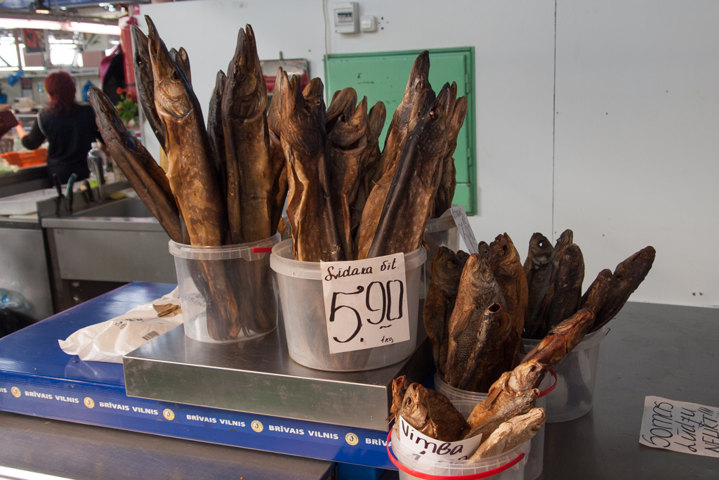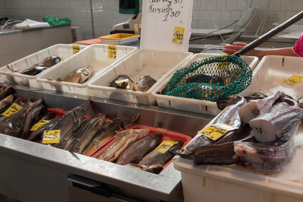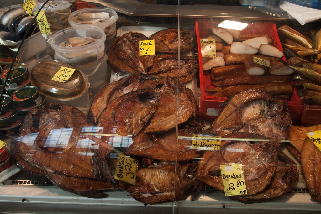 とはいえ、やはり魚はあらかじめ加工された状態で売買されることが多いようです。たくさんの種類の薫製があって、元の魚の種類が想像できないものもありました。長細い形の魚の薫製が、まるでフランスパンのように立てて並べてある光景が面白かった。