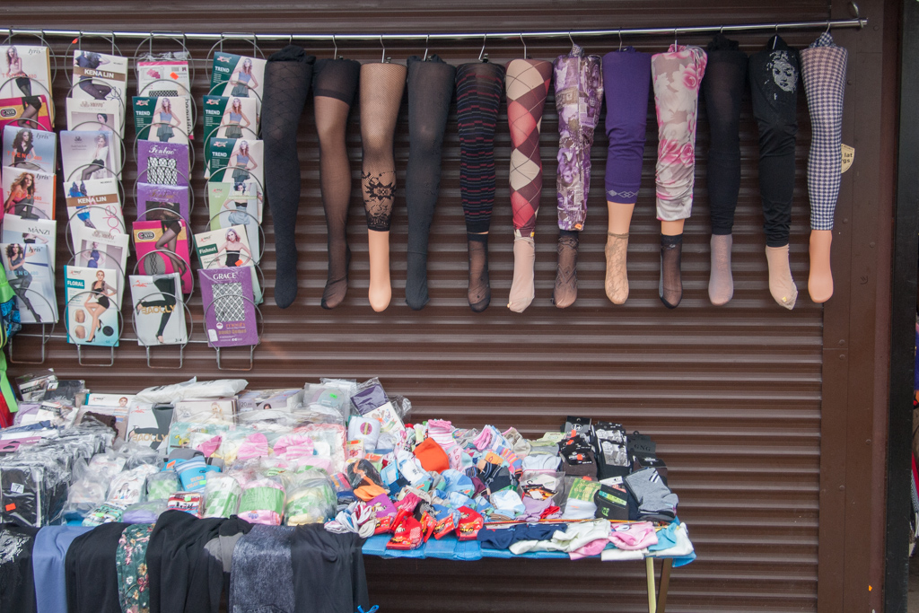市場には食べ物だけでなく、日用品も扱っています。こんな面白いディスプレイ(?)も見かけました。ストッキングをこうして見せれば、確かにわかりやすいですよね。。 あと、女性ものの巨大なパンツとかも見かけました。ロシアンサイズかな??
