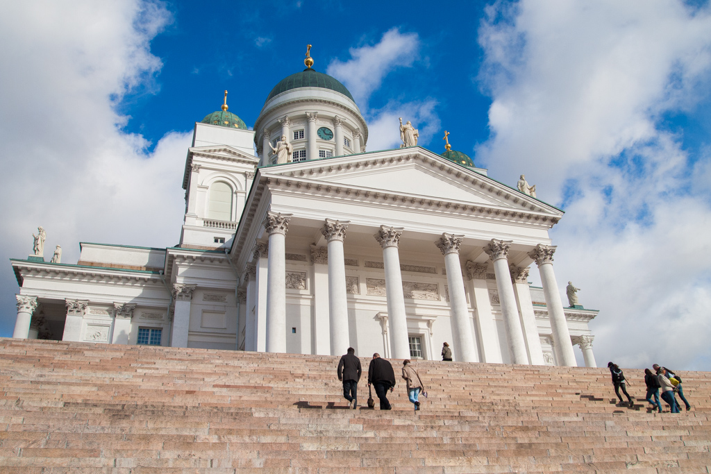 タリン行きの西ターミナルへの直通のバスは12時半の出発。まだ充分に時間あったので、有名な「ヘルシンキ大聖堂」に行ってみることに。だいたいの見当をつけて歩き始めてみたら、どこかで道を1本間違えたらしく、しばらく歩いてもそれらしくものはまったく見えてこない...。地図を見ながら困っていたら、また通りがかりの若い女性が声をかけてくれました。ヘルシンキはなんて親切な方が多いのでしょう。。