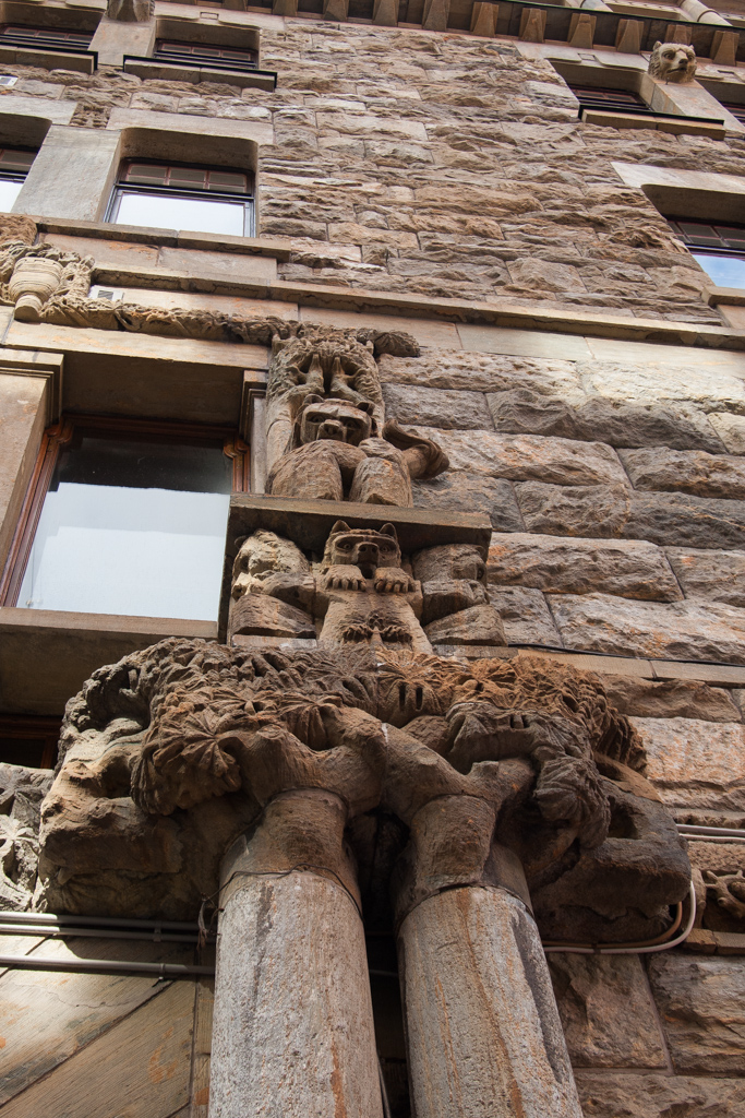 街を歩いていたら、こんなユニークな石像や壁面の装飾に出会いましたよ。