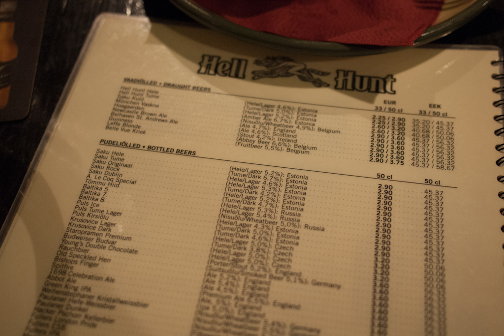 エストニアのビールは基本的に「Hele=ラガー」か「Tume=ダーク」のどちらかのテイスト。ダークと言っても、黒ビールではなく褐色の色で少し濃いめな味。店員さんにお店のオリジナルビール以外で地元のおすすめの銘柄を聞いてみたら、即答で「Saku!」と答えてくれました。「Saku」は大きなメーカーのようで、たくさんの種類のテイスト&銘柄があります。