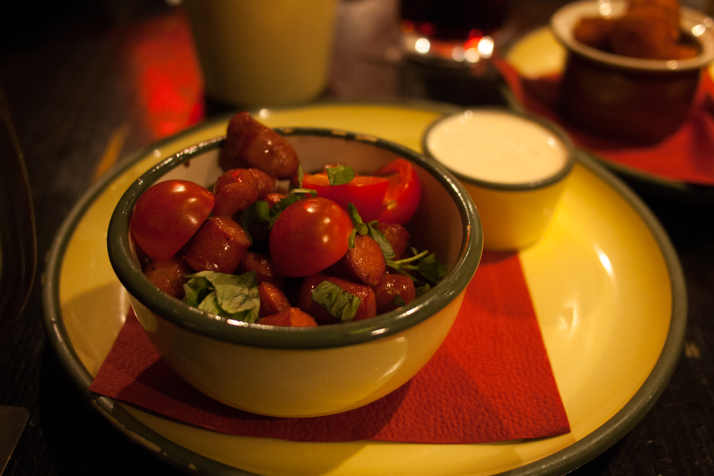 この日はビール飲むことがメインだったので、地元らしい料理にはこだわりませんでした。ビールに合いそうなソーセージやチーズとか適当に注文。ソーセージを頼んだらこんな素敵な盛りつけ。下はクリームチーズのフライ。