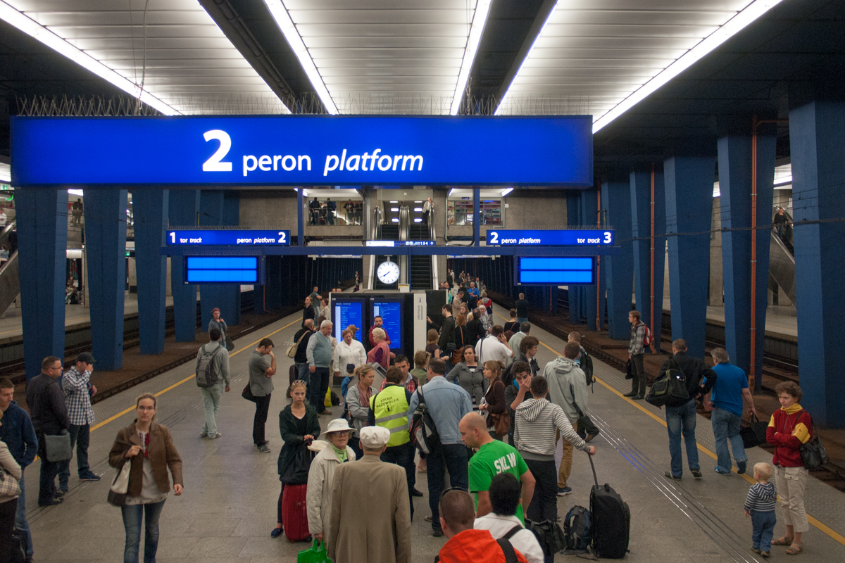ワルシャワ空港のサインデザインはオレンジで統一されてましたが、セントラル駅はブルーでまとめられてます。駅の設備は新しく、長距離切符の販売機なども新しいシステムが使われていて、とてもわかりやすかった。