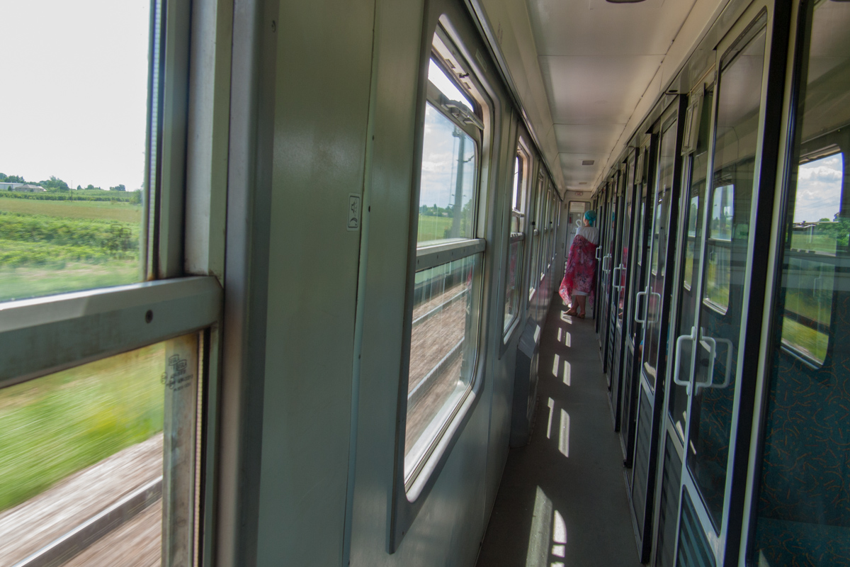 眠くなるほどに変化のない田園風景が続くのですが、私は鉄道の旅にすっかり興奮してしまって、じっとしていられません。駅に停車する度に窓から体を乗り出して周りを見渡してみたり、意味もなく列車内を歩いてみたり。